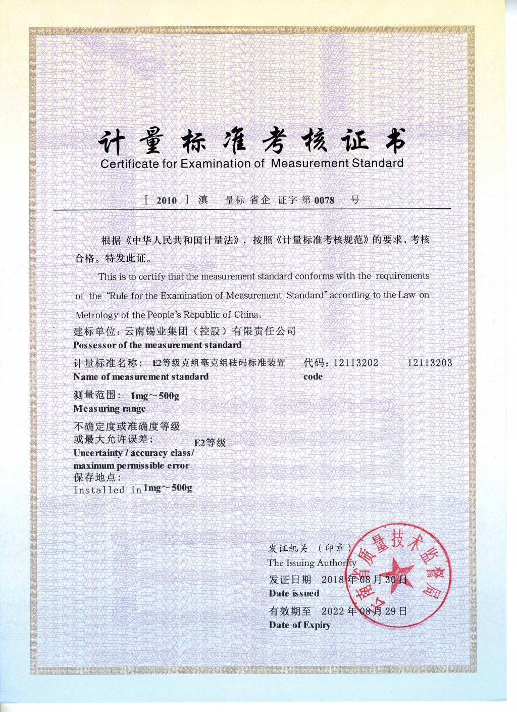 云南省質(zhì)量技術(shù)監(jiān)督局計(jì)量標(biāo)準(zhǔn)考核專家組從計(jì)量標(biāo)準(zhǔn)器及配套設(shè)備、計(jì)量標(biāo)準(zhǔn)器的主要計(jì)量特性、環(huán)境條件和設(shè)施、人員配置、管理制度辦法制定和實(shí)施情況、計(jì)量標(biāo)準(zhǔn)測量能力等方面對各項(xiàng)計(jì)量標(biāo)準(zhǔn)裝置進(jìn)行審查,一致認(rèn)為云錫各項(xiàng)計(jì)量標(biāo)準(zhǔn)的運(yùn)行條件和測量能力滿足國家《計(jì)量標(biāo)準(zhǔn)考核規(guī)范》的要求,對11項(xiàng)計(jì)量標(biāo)準(zhǔn)給予一次通過復(fù)查考核。
