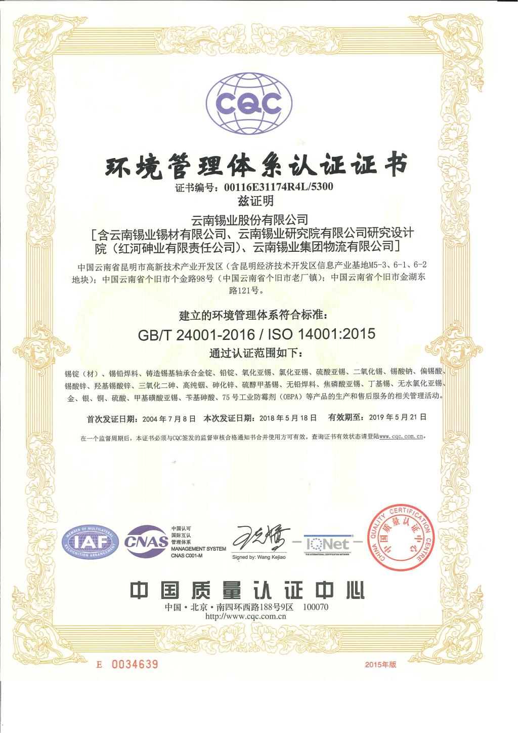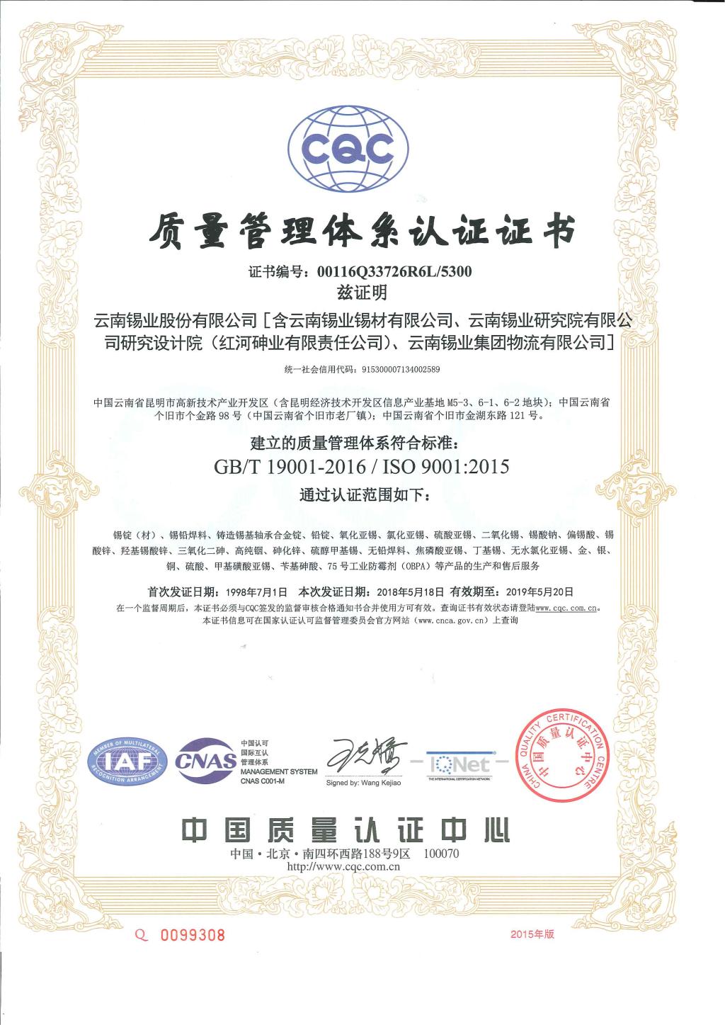 錫業股份質量環境管理體系獲ISO新版標準認證證書