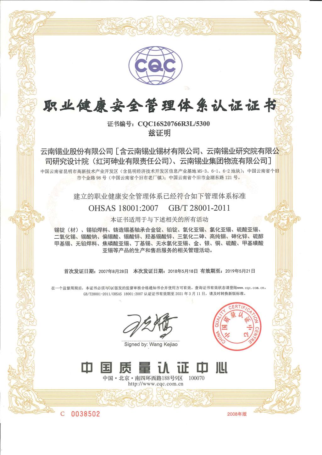 2017年,錫業股份根據國家新發布的質量管理體系(GB/T 19001-2016/ISO 9001:2015)、環境管理體系(GB/T 24001-2016/ISO 14001:2015)標準要求,特邀中國質量認證中心CQC云南評審中心專家到公司,對體系覆蓋單位的內審員、管理人員進行質量、環境管理體系新版標準及職業健康安全管理體系標準宣貫培訓。隨后,公司組織有關部門、單位根據新版標準要求識別公司的主要過程,建立高效簡練的管理流程,針對可能存在的風險、機遇及后果,制定相應的控制措施以及量化的過程控制績效指標,在中心老師的指導下,修改舊版文件形成新版管理體系文件發布實施。經公司內部試運行、內部審核及管理評審,2018年4月初通過中國質量認證中心CQC云南評審中心的換版認證現場審核及監督審核。