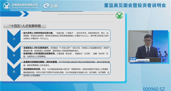 董事長、總經(jīng)理劉路坷介紹了公司資源、業(yè)務(wù)產(chǎn)業(yè)鏈、產(chǎn)品及近期生產(chǎn)經(jīng)營情況,同時充分闡述了公司未來發(fā)展戰(zhàn)略,即圍繞著打造全球錫、銦全產(chǎn)業(yè)鏈供應(yīng)鏈“鏈主”的發(fā)展愿景,以“綠色智能補鏈、精深加工延鏈、改革創(chuàng)新強鏈”為發(fā)展理念,圍繞資源拓展、現(xiàn)代礦山、原材料制造、新材料和精深加工、供應(yīng)鏈五個業(yè)務(wù)單元布局有色金屬全產(chǎn)業(yè)鏈,助推上市公司高質(zhì)量發(fā)展。