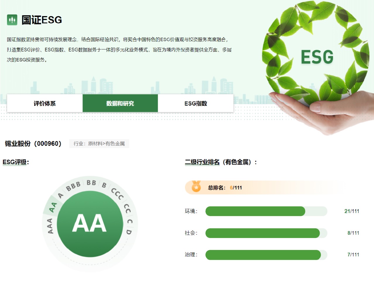 近日,深圳證券交易所全資子公司深圳證券信息有限公司正式推出了國(guó)證ESG(環(huán)境、社會(huì)和公司治理)評(píng)價(jià)方法,并發(fā)布了基于該評(píng)價(jià)方法編制的ESG基準(zhǔn)指數(shù)和ESG領(lǐng)先指數(shù)。錫業(yè)股份憑借在社會(huì)責(zé)任、公司治理和生態(tài)環(huán)保等方面的優(yōu)異表現(xiàn),國(guó)證ESG評(píng)級(jí)達(dá)到AA,位居深交所有色金屬行業(yè)111家上市公司的第六位,同時(shí)位列深交所上市的云南有色上市公司首位,并成功入選深指ESG基準(zhǔn)指數(shù)和深指ESG領(lǐng)先指數(shù)。
