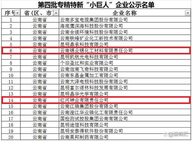 信息顯示:云南省共有20家企業入選國家第四批專精特新“小巨人”企業名單,云錫錫化工、紅河砷業公司2家單位榮登榜單。