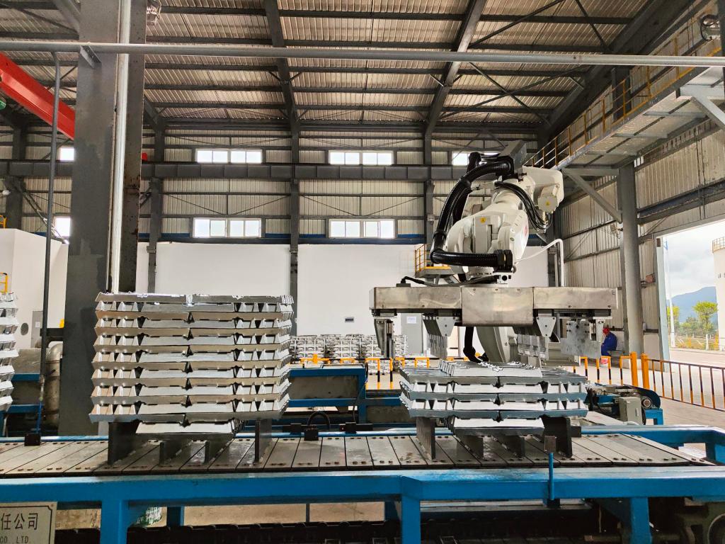 文山鋅銦年產3萬噸壓鑄鋅合金項目是云錫文山片區兩公司“倍增翻番”計劃項目之一,也是文山州2022年“四個三十”重點建設項目之一,同時也是公司依托年產10萬噸鋅冶煉熔鑄系統高效穩定運行基礎優化升級實施項目,采用先進、環保、節能的合金工藝和設備,主體設備選用“有芯感應爐+可傾有芯感應爐+電阻保溫爐”,配套液壓升降式加料裝置,合金爐自帶稱重保障精準配料,探針聯鎖穩定控制出液流量,機器人高效自動扒皮,風冷搭配均水噴淋,激光打碼自動碼垛、打包、稱重、貼簽,全流程自動化高,控制精準,操作規范,精選99.996%以上鋅片搭配99.85%重熔鋁錠和99.95B鎂錠作為合金錠生產原料,與現有工藝實現閉環,形成了一套完整的環保、低耗、資源綜合利用的冶煉產業鏈體系。該項目于2022年8月8日開工,10月9日點火烘爐,10月27日投料一次性產出合格產品,其產品表面光滑平整、斷面晶粒均勻、金屬質感強、錠垛規整,物規質量、化學成分穩定,各項指標明顯優于國標。