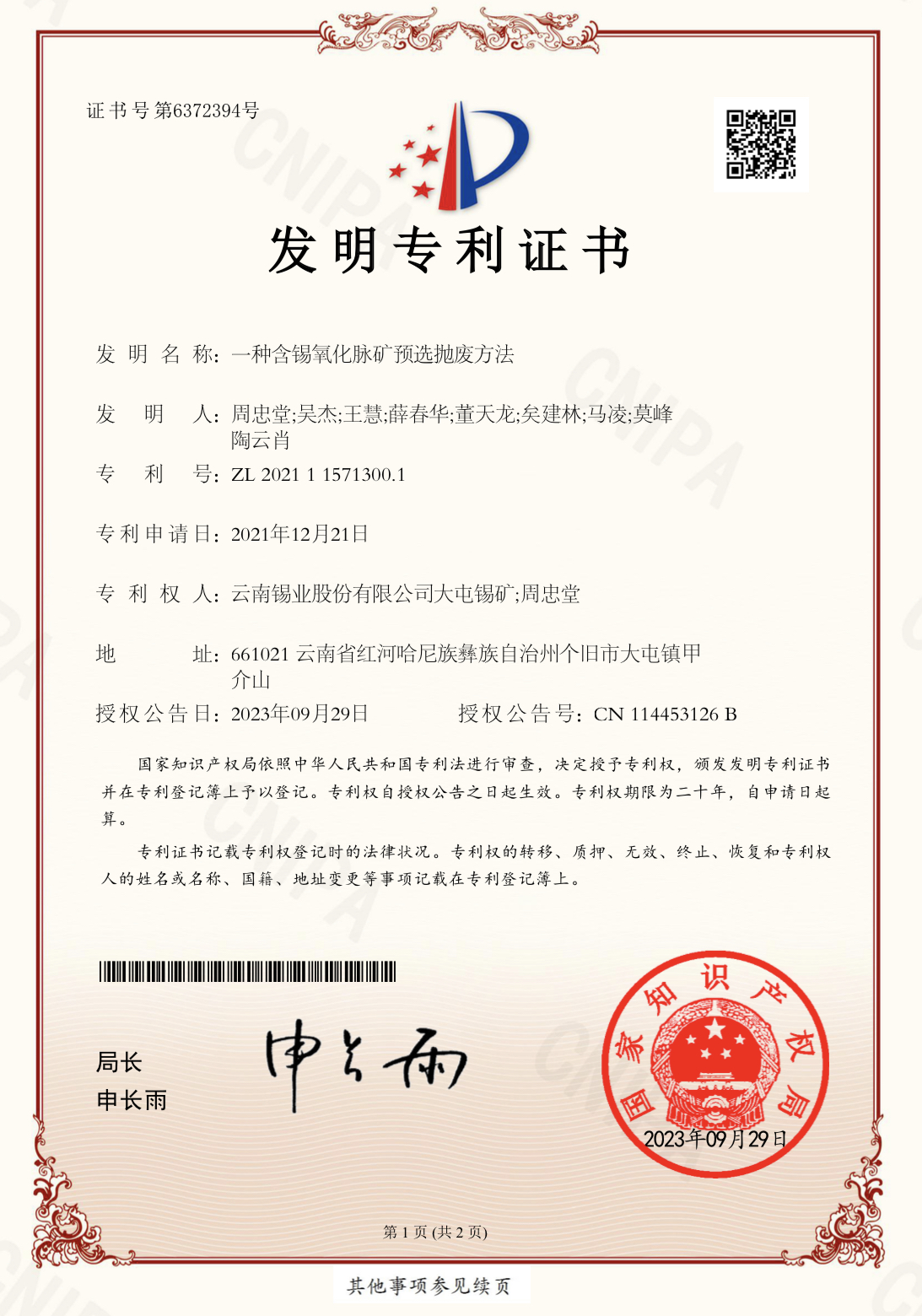 9月29日,繼大屯錫礦研發(fā)的“一種銅錫共生硫化礦預(yù)選分級(jí)選礦方法”發(fā)明專利于2023年6月獲國家知識(shí)產(chǎn)權(quán)局正式授權(quán)的基礎(chǔ)上,大屯錫礦“一種含錫氧化脈礦預(yù)選拋廢方法”再獲國家發(fā)明專利!