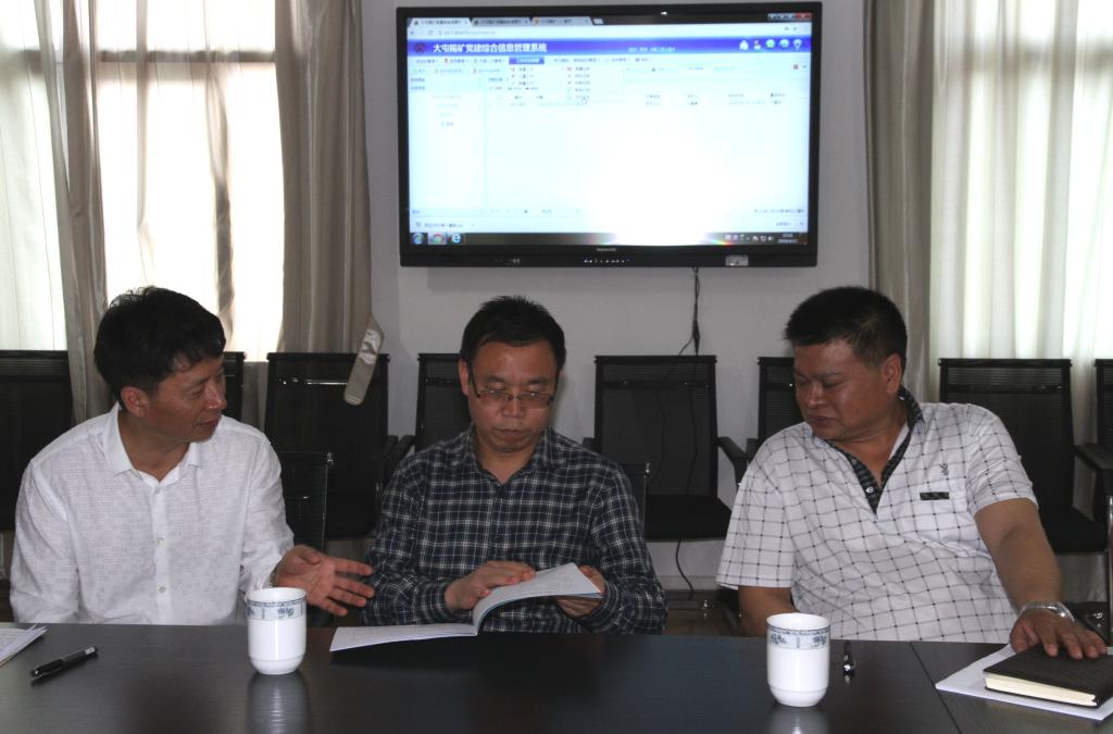 “目前有多少黨員?‘三會一課’制度是否按要求執(zhí)行?黨員對一系列黨建工作是什么態(tài)度?”姚家立在檢查三坑黨總支黨員活動室建設工作時,詢問了黨建工作相關情況。三坑黨總支書記逐一回答了姚副書記的提問,并就所開展的黨建工作情況作了匯報,其中,組織黨員觀看央視專題片《榜樣》,開展“看榜樣、學榜樣、爭做榜樣”活動;設立坑下黨員活動陣地,結合安全工作推行現(xiàn)場標準化定置管理等特色實踐活動。三坑坑長對坑口人力資源配置、今年以來的生產(chǎn)組織情況作了匯報。組織人力資源部門介紹并演示了正在測試的大屯錫礦黨建綜合信息管理系統(tǒng),該系統(tǒng)分為組織管理、黨員管理、干部人才管理、工作任務管理和學習交流五大模塊,具備權限分級、保密性強、覆蓋面廣和兼有互動等特點,通過系統(tǒng)建設與管理,可實現(xiàn)基層黨建“標準化建設、程序化控制、痕跡化管理、常態(tài)化考核、持續(xù)化改進,特色化發(fā)展”。